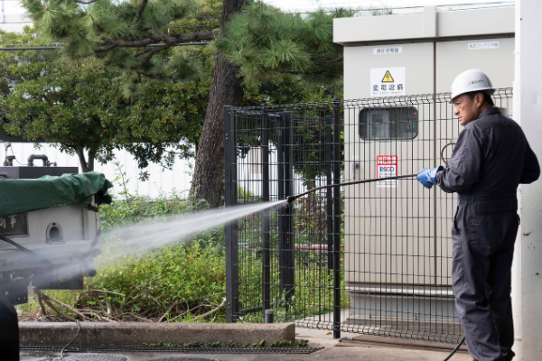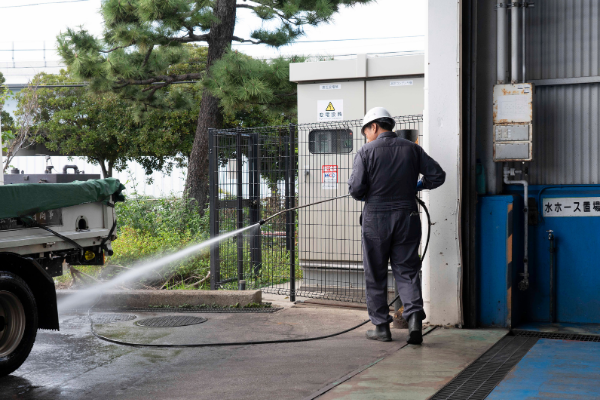 高圧ノズルで泥・粉塵・油汚れを一気に除去。